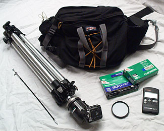 On a typical photo shoot, I also pack a Bogen 3001 tripod, Velbon PH-173Q ballhead, cable release, Gossen Luna-Pro or Pentax 1º spotmeter, polarizer, and lots of film--About 15 pounds in all. All but the tripod and head fits with room to spare in a large Jansport fanny-pack.